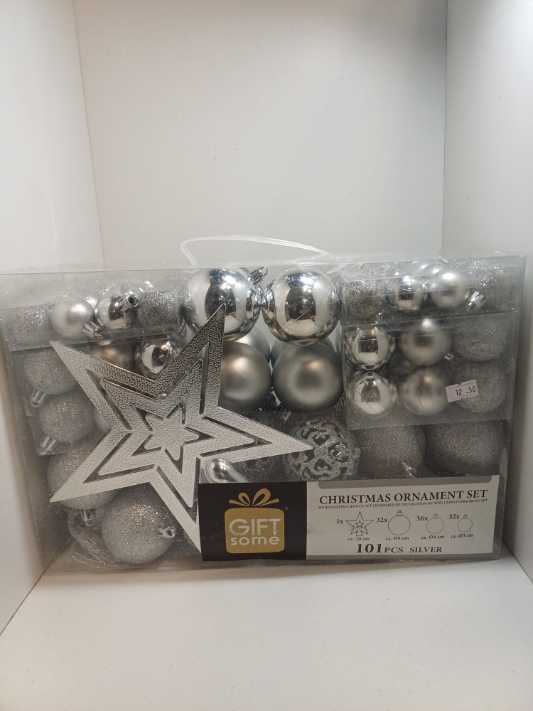 Maak je kerstboom sprankelend en elegant met onze set van 101 zilverkleurige kerstballen, perfect voor een stijlvolle en feestelijke kerstversiering. Deze glanzende ballen voegen een prachtige zilveren glans toe, waardoor je huis in een magische kerstsfeer wordt gehuld. De set wordt geleverd in één handige doos, zodat je gemakkelijk je kerstboom kunt versieren en je kerstdecoratie compleet kunt maken. Breng schittering en charme in je kerstfeest met deze prachtige zilverkleurige kerstballen!