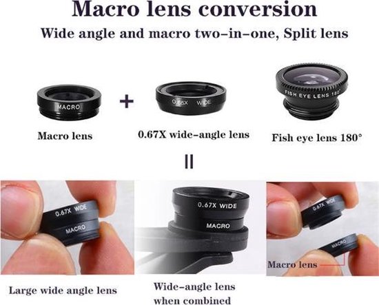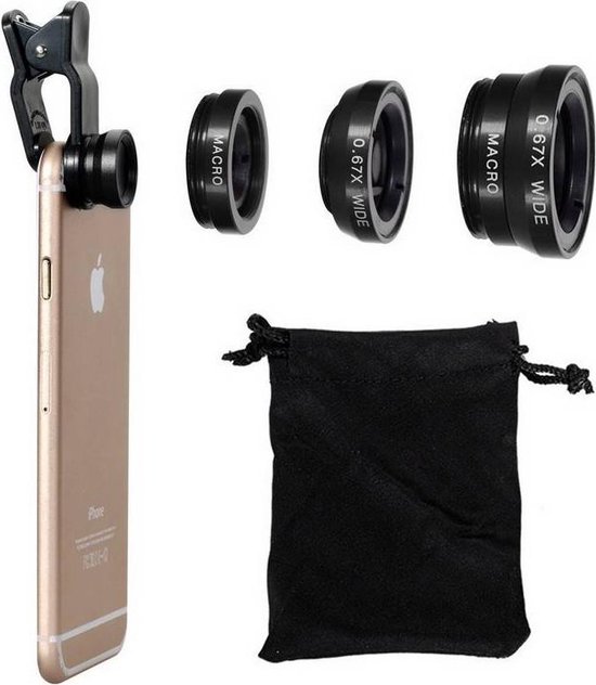 Ontdek onze universele smartphone-lensset, inclusief een 1x fisheye, 1x macro en 1x 0,67x wide-angle lens voor spectaculaire foto’s. Alles wordt geleverd in een handig kunststof doosje met opbergzakje, perfect voor onderweg en gemakkelijk mee te nemen. Maak elke foto uniek en professioneel met deze complete lensset!