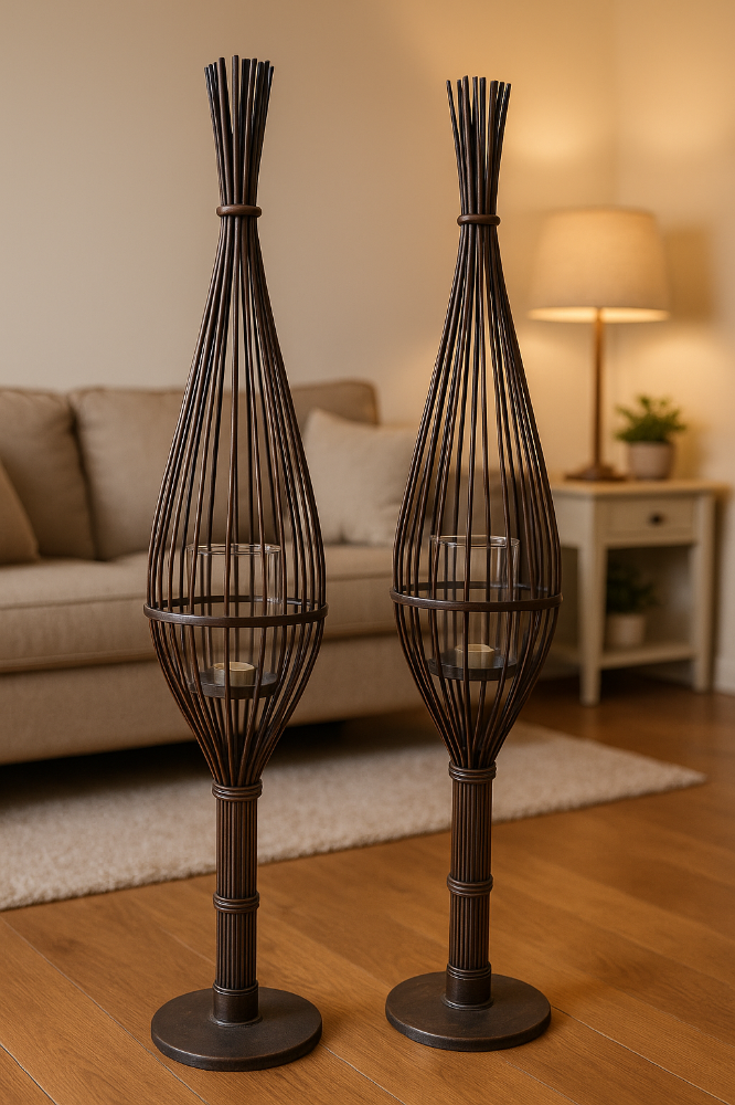 Ontdek onze prachtige set windlichten van rotan, hout en glas, elk 110 cm hoog, perfect voor sfeervolle binnen of buitenruimte voor gezellige avonden.