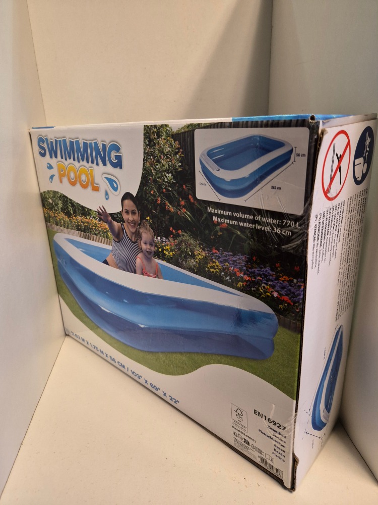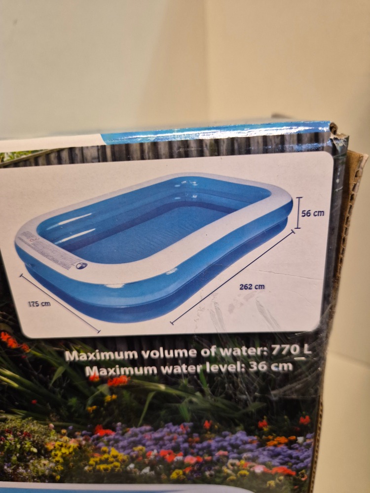 Geniet deze zomer van waterpret met ons ruime opblaas zwembad! Met afmetingen van 262 cm lang, 175 cm breed en 56 cm hoog biedt dit zwembad volop ruimte voor plezier voor het hele gezin. Perfect voor op je tuin of terras, snel op te zetten en klaar voor gebruik. Maak je zomer onvergetelijk met dit comfortabele en stevige opblaasbad!